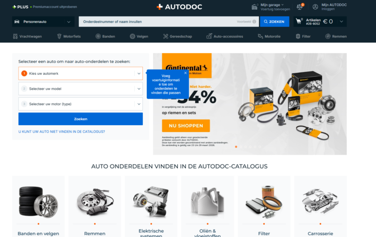 Bij AUTODOC zie je op populaire onderdelen vaak stevige prijsdalingen. Op de homepage stonden onder meer een BOSCH-accu met 74% korting, een GH-veerpoot met 61% korting en diverse BREMBO-remonderdelen met duidelijke afprijzingen. Dat maakt het slim om eerst te checken op accu’s, remblokken, remschijven en vering. Vooral bij courante vervangstukken kan het verschil oplopen van “aardig meegenomen” tot “dat is bijna een volle tank”.