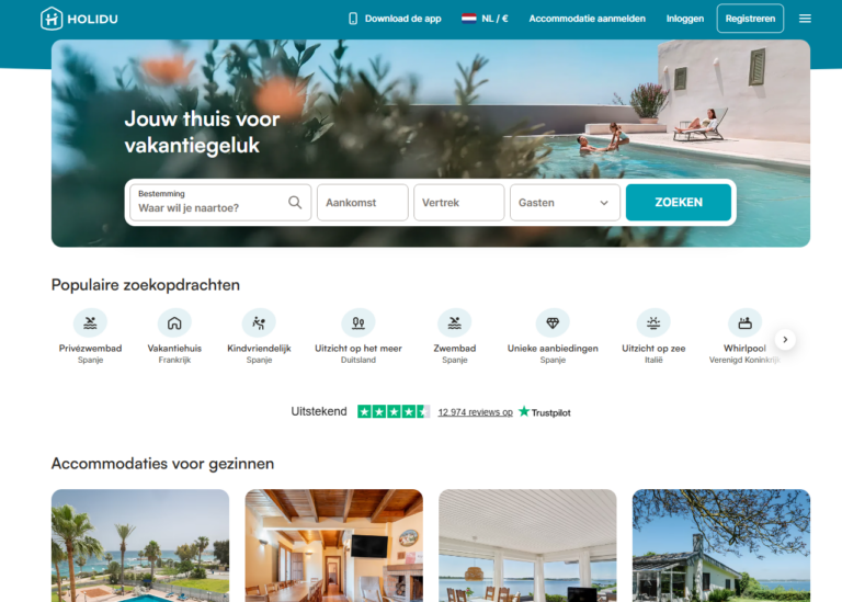 Wat ik slim vind: Holidu focust op transparantie. Je ziet meteen prijsverschillen en bespaart snel tientallen euro’s per boeking. Ze bieden meer dan 15 miljoen accommodaties aan, van budget tot luxe villa’s. Tip van ons: boek buiten het hoogseizoen en gebruik filters slim. Zo scoor je makkelijk extra korting zonder in te boeten op kwaliteit.