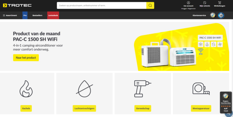 Trotec speelt sterk in op het seizoen. In de zomer zie je scherpe prijzen op mobiele airco’s en ventilatoren, terwijl in de winter ontvochtigers en verwarmingstoestellen vaak in promo staan. Mijn aanpak: